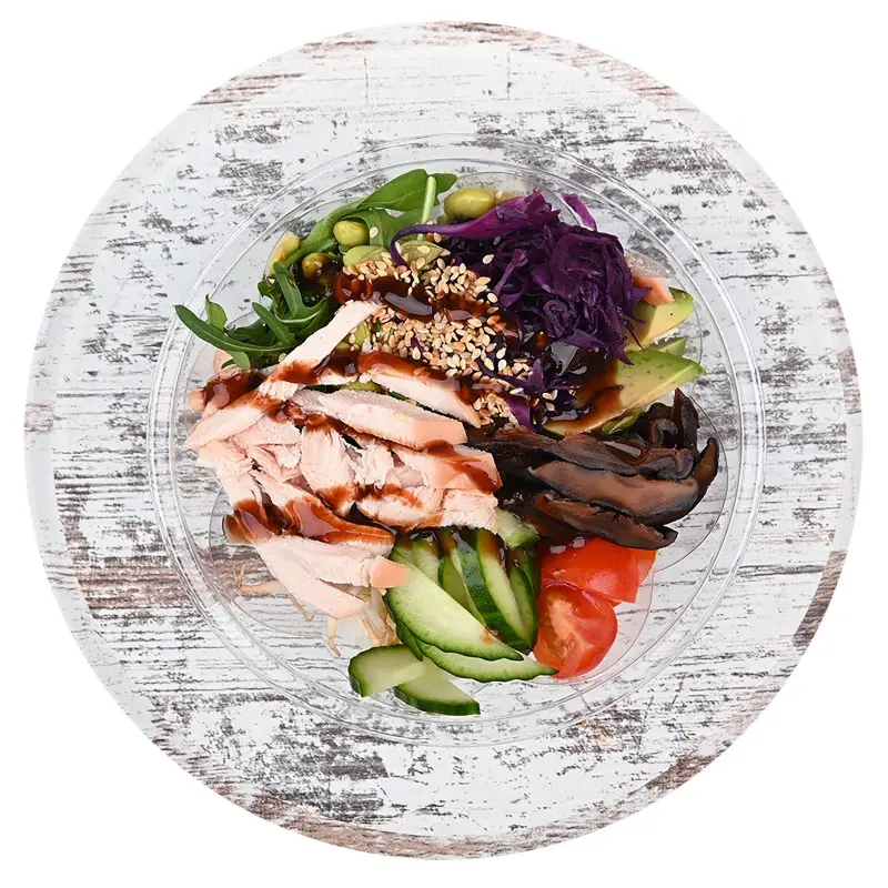 grilled chiken breast, bean sprouts, cherry tomato, avocado, rucola, edamame beans, coriander, cabbage, cucumber, shiitake mushroom, sesameseed