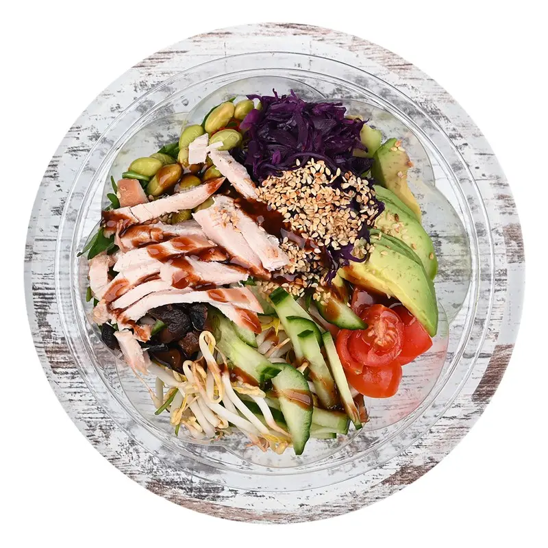 grilled chiken breast, bean sprouts, cherry tomato, avocado, rucola, edamame beans, coriander, cabbage, cucumber, shiitake mushroom, sesameseed