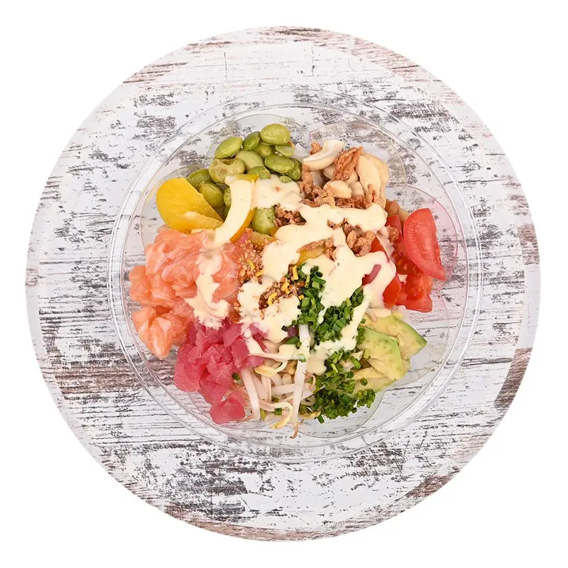 tuna, salmon, beans sprouts, avocado, cashew nuts, edamame beans, cherry tomato, furikake, chives, bell pepper, crisp onion crumbs