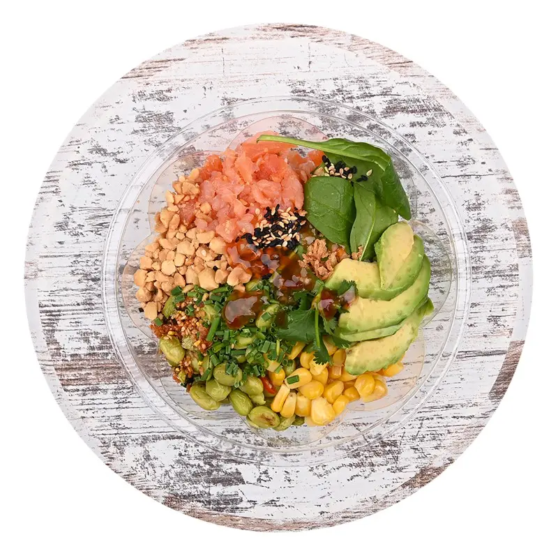 smoked salmon, spinach, edamame beans, avocado, sweet corn, crisp onion crumbs, furikake, chives, peanuts, coriander, sesameseed