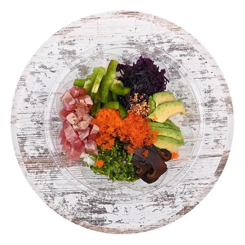 grilled tuna, avocado, bell pepper, cabbage, shiitake mushroom, masago, red tobico, chives, furikake