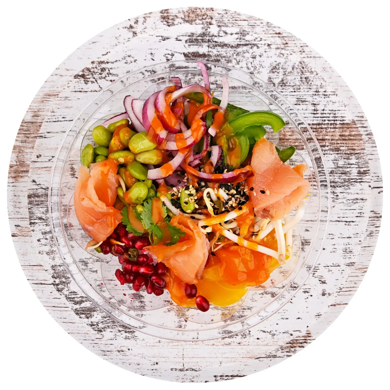 smoked salmon, mango, pomegranate, red onion, edamame bean, bell pepper, coriander, lime, bean sprouts, sesame seeds