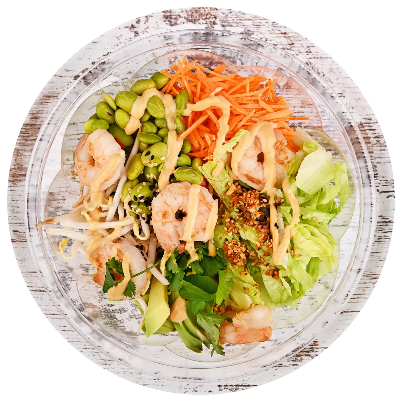 garnélarák, edamame bab, avokádó, sárgarépa, jégsaláta, babcsíra, koriander, szezámmag, furikake