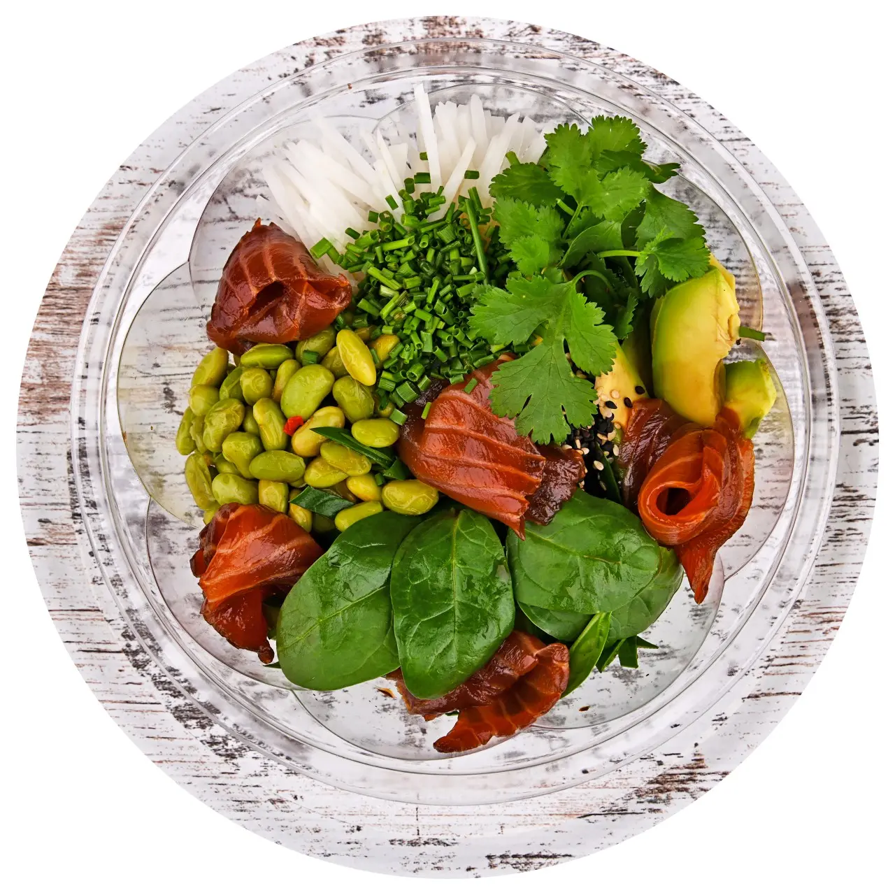 lazac, spenót, edamame bab, avokádó, kukorica, kaliforniai paprika, jégcsapretek, koriander, metélőhagyma, szezámmag, kukorica, uborka